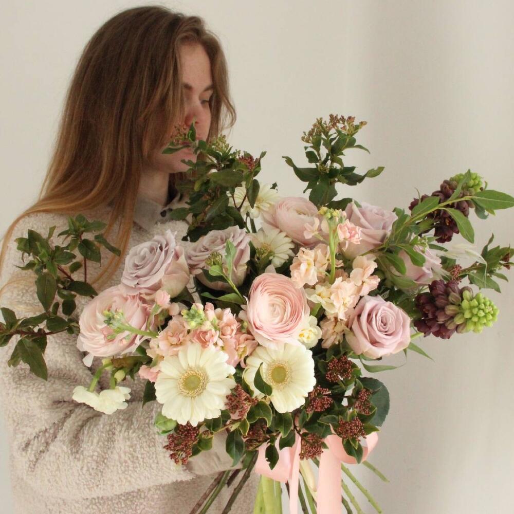 Ранункулюс – 3 шт.Роза сортовая – 5 шт.Гербера – 4 шт.Нарцисс кустовой – 3 шт.Маттиола – 3 шт.вибурнум цветущий – 5 шт.Лента атласная – 1 шт.