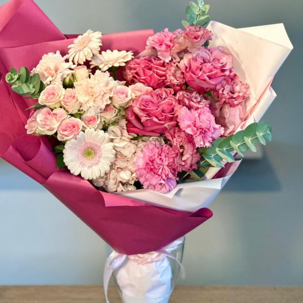 Роза кустовая – 2 шт.Роза одноголовая – 3 шт.Гербера мини – 2 шт.Гвоздика – 5 шт.Лизиантус – 1 шт.Эвкалипт – 1 шт.Гортензия – 1 шт.Упаковка дизайнерская – 1 шт.Лента атласная – 1 шт.