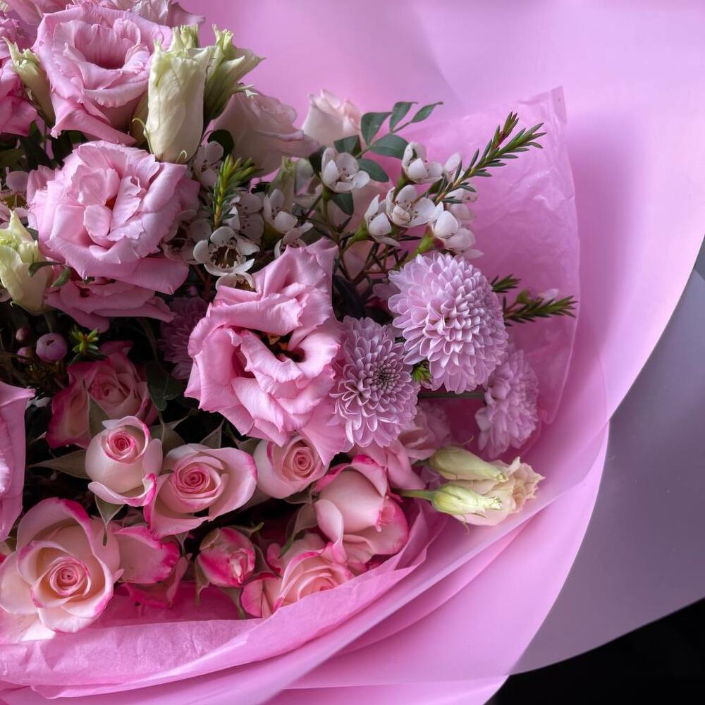 Малиновый зефир: розы, эустома и хризантема