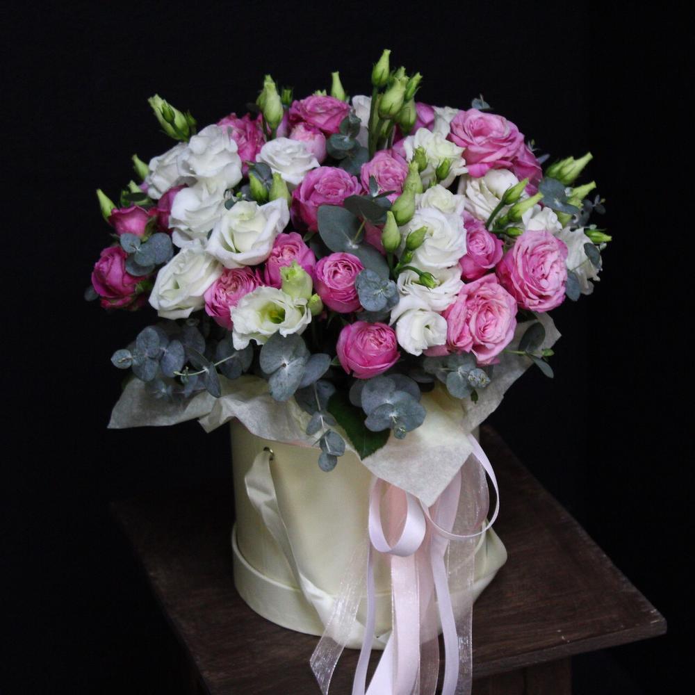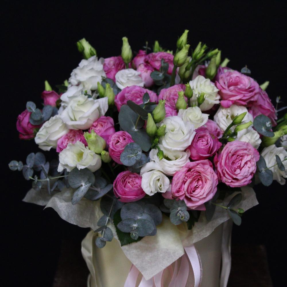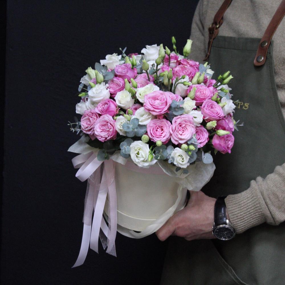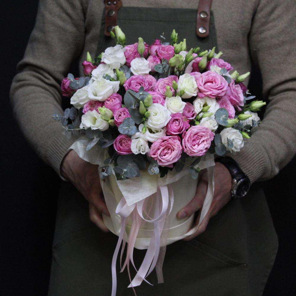 Пионовидная кустовая роза – 7 шт.эустома белая – 5 шт.Коробка шляпная – 1 шт.Оазис флористический – 1 шт.Эвкалипт Baby Blue – 5 шт.Лента атласная – 3 шт.
