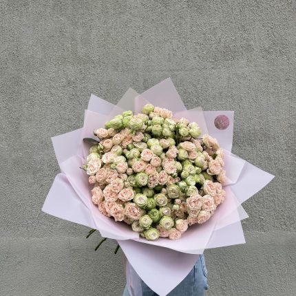 Упаковка дизайнерская – 2 шт. Открыточка с вашими пожеланиями – 1 шт. Misty Bubbles пионовидная роза – 11 шт.