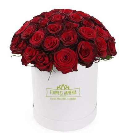 Красные розы 35 шт. сорта «Эксплорер» в черной каробке. Размер 25×35 см.