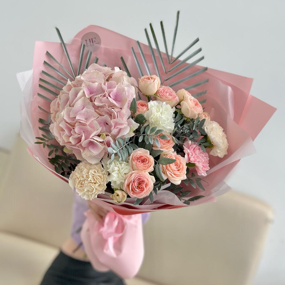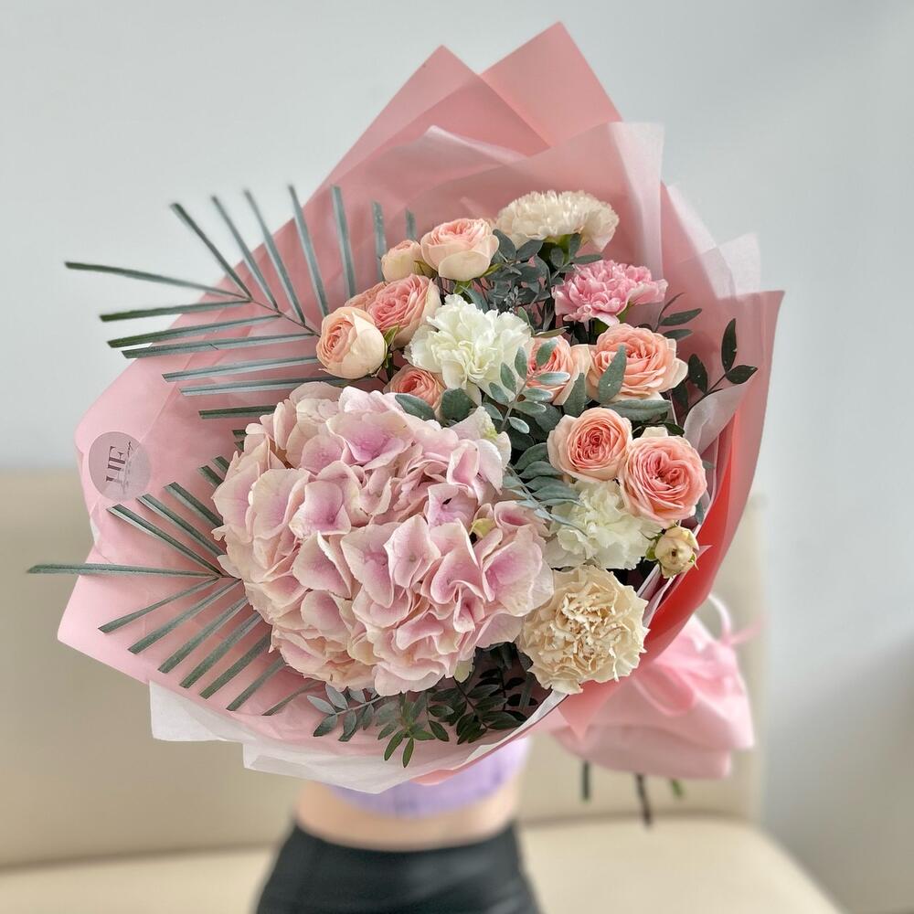 Гортензия – 1 шт.Роза кустовая – 2 шт.Лента атласная – 2 шт.Диантус – 5 шт.Пальма – 1 шт.Упаковка дизайнерская – 5 шт.
