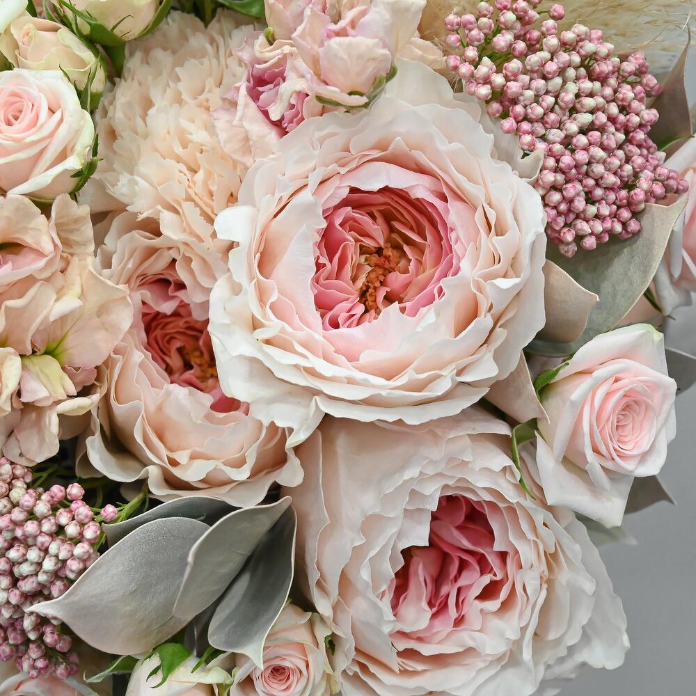 Лента – 1 шт.Маттиола – 3 шт.Озотамнус – 3 шт.Рускус – 7 шт.Кустовая роза – 3 шт.Гвоздика – 4 шт.Пионовидная роза – 3 шт.Помпасная трава – 1 шт.