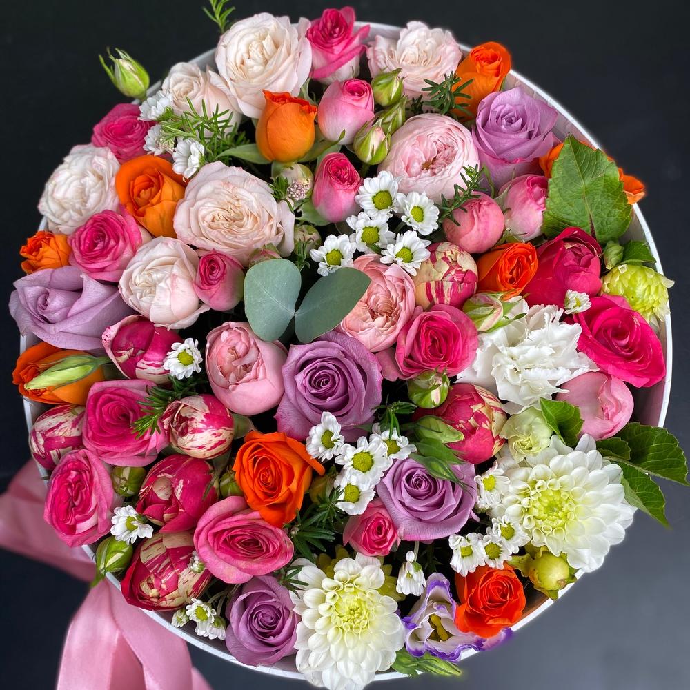 Альстромерии, Гвоздики, Кустовые розы, Лизиантусы, Розы, Хризантемы