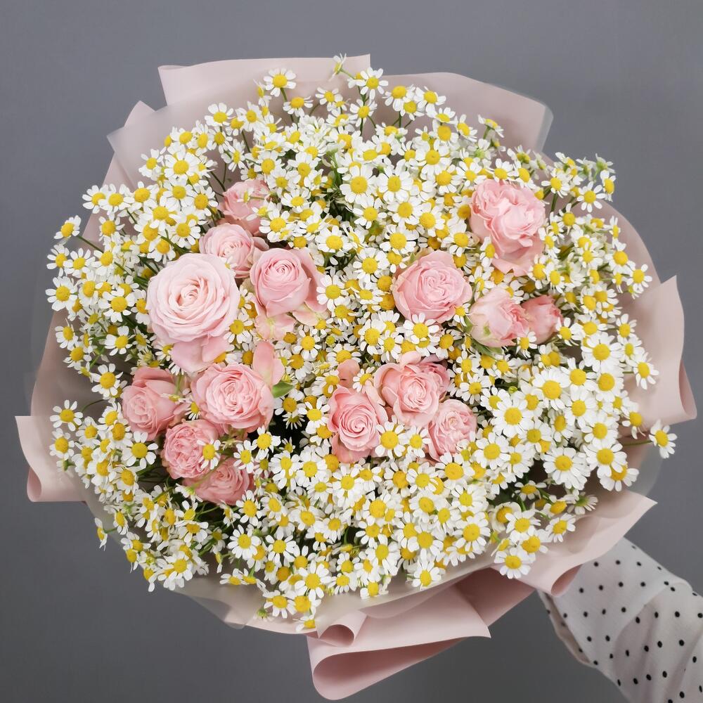 Роза кустовая Бомбастик – 4 шт.Упаковка – 1 шт.Ромашка кустовая – 19 шт.Аквапак – 1 шт.питательная смесь для срезанных цветов – 2 шт.