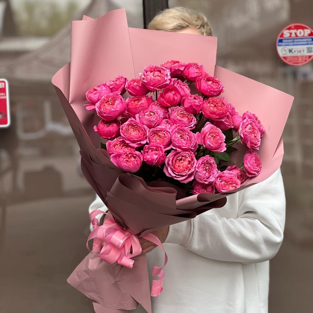 Зелень – 10 шт. Лента атласная – 1 шт. Роза пионовидная кустовая – 9 шт. Упаковка дизайнерская – 8 шт.