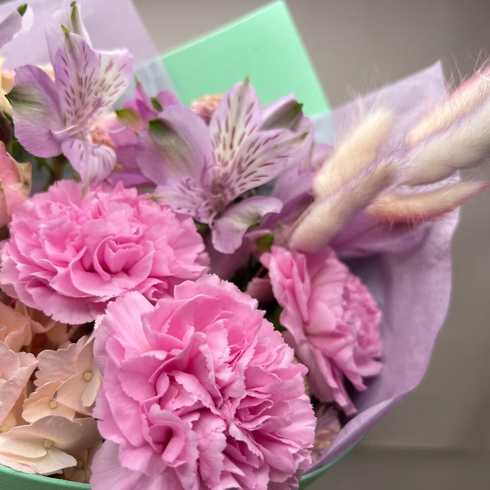 Альстромерии, Гвоздики, Кустовые розы, Лизиантусы, Розы, Хризантемы
