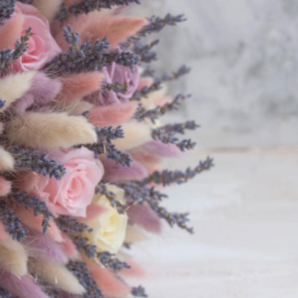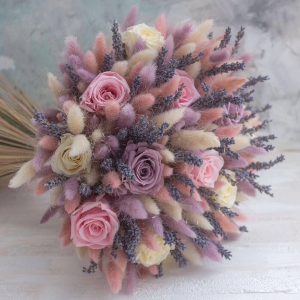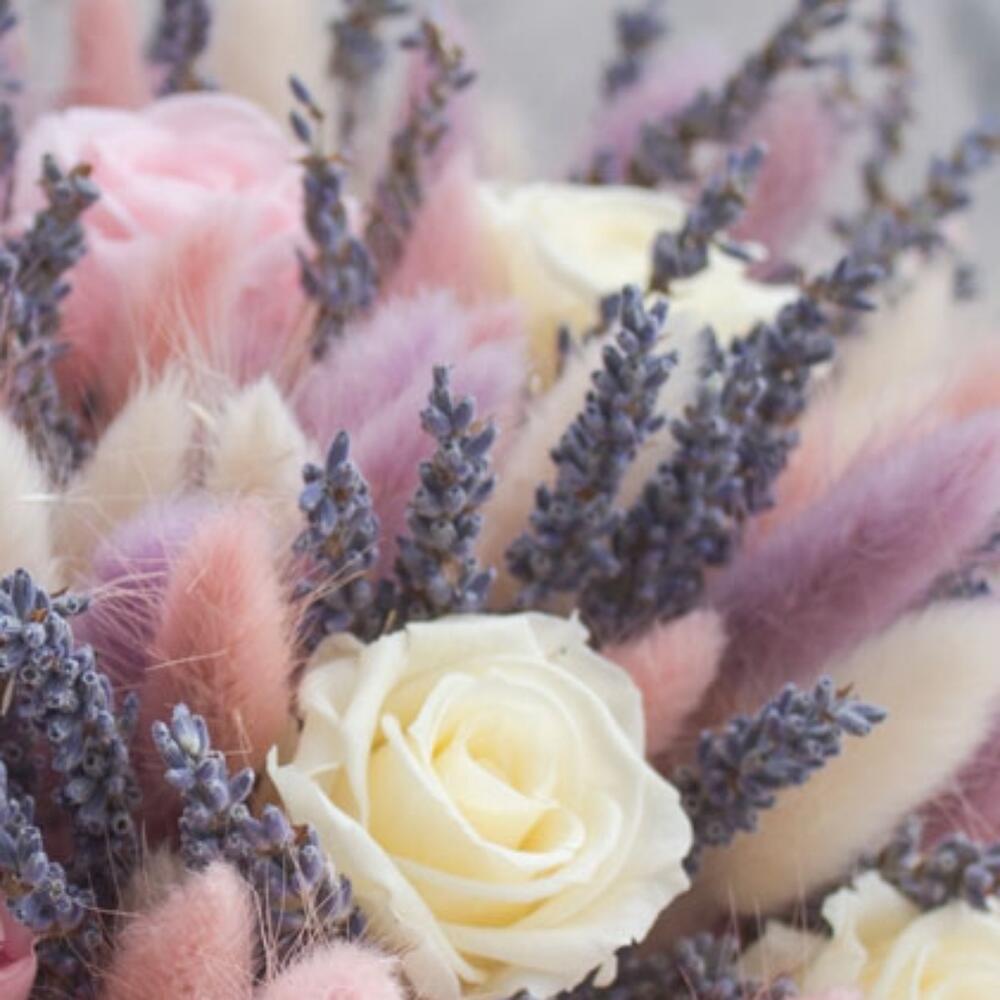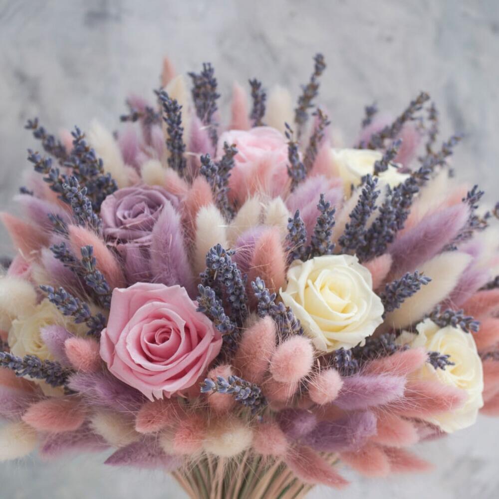 Лагурус (сухоцвет) – 30 шт.Лаванда (сухоцвет) – 35 шт.Роза – 15 шт.Лента атласная – 1 шт.