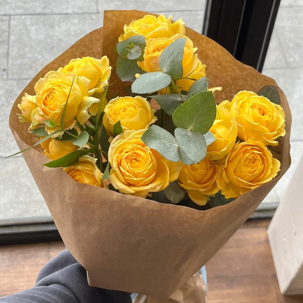 Упаковка дизайнерская – 1 шт. Открыточка с вашими пожеланиями – 1 шт. инструкция по уходу за цветами – 1 шт. желтые кустовые розы – 7 шт.