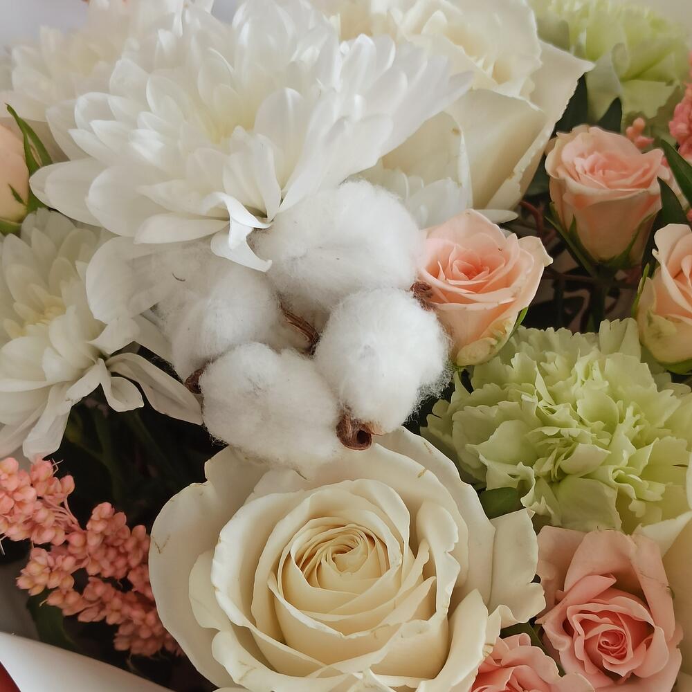 Альстромерии, Гвоздики, Кустовые розы, Лизиантусы, Розы, Хризантемы