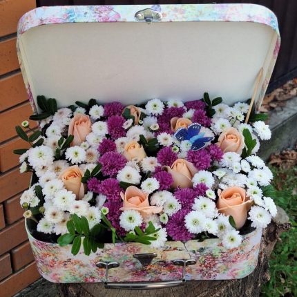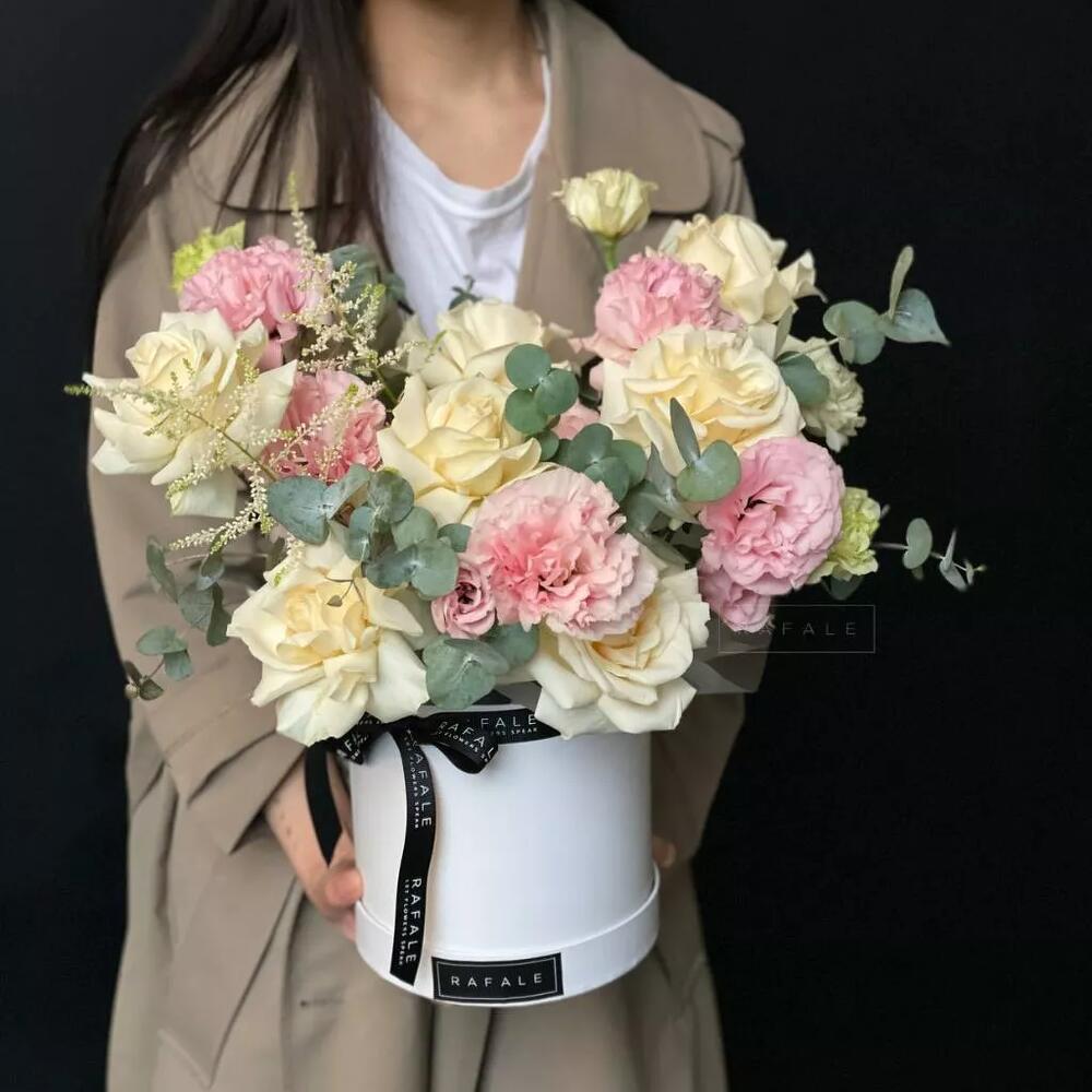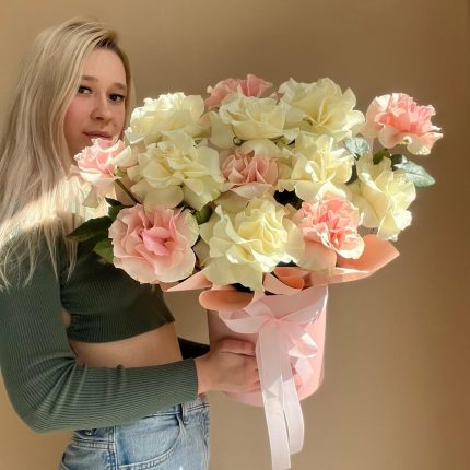 “Атлас☁️” – цветочная композиция с зефиром в деревянном ящике