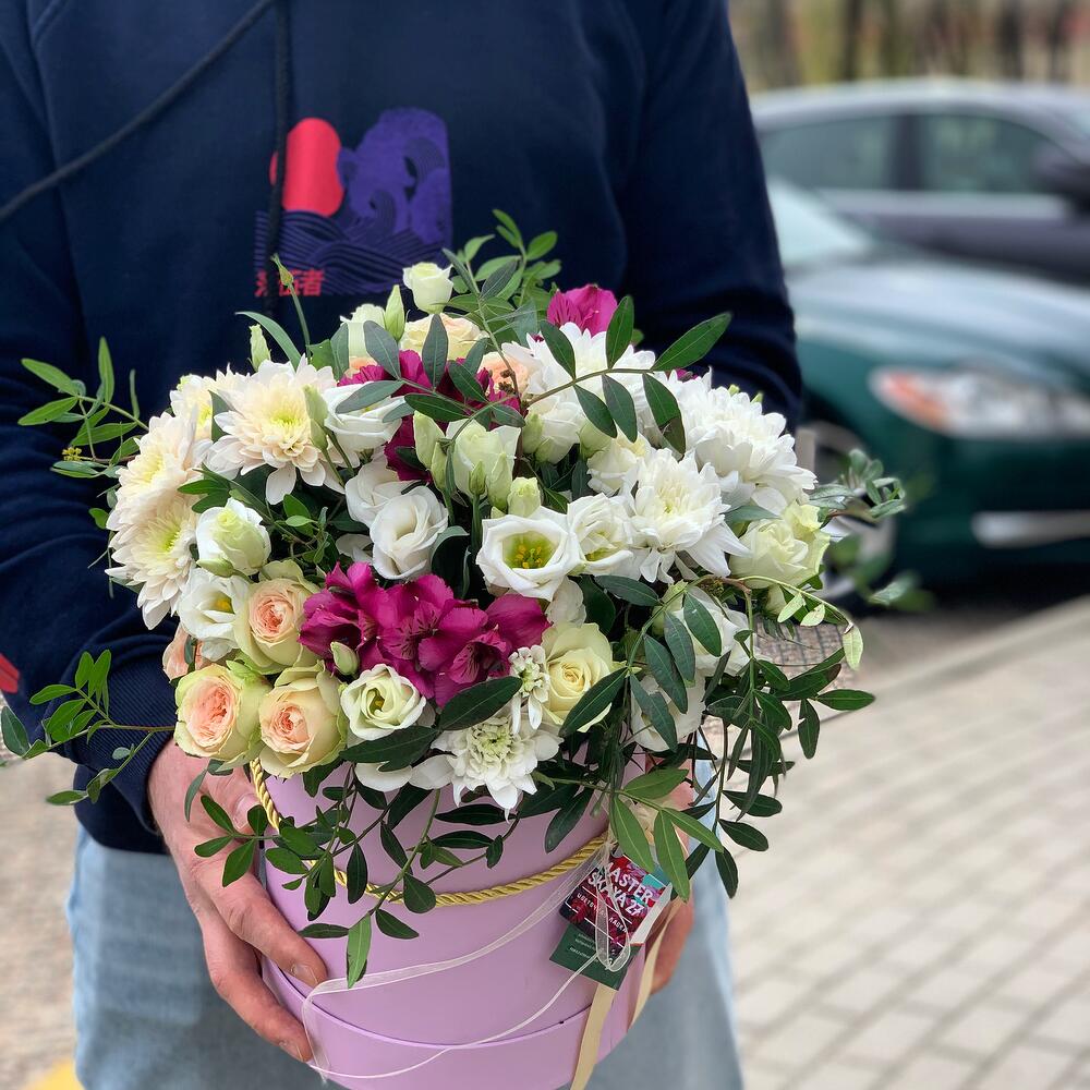 Шляпная коробка с цветами, в составе которой эустома, кустовая хризантема, кустовая розочка приятного кремового цвета, альстромерия, писташ.