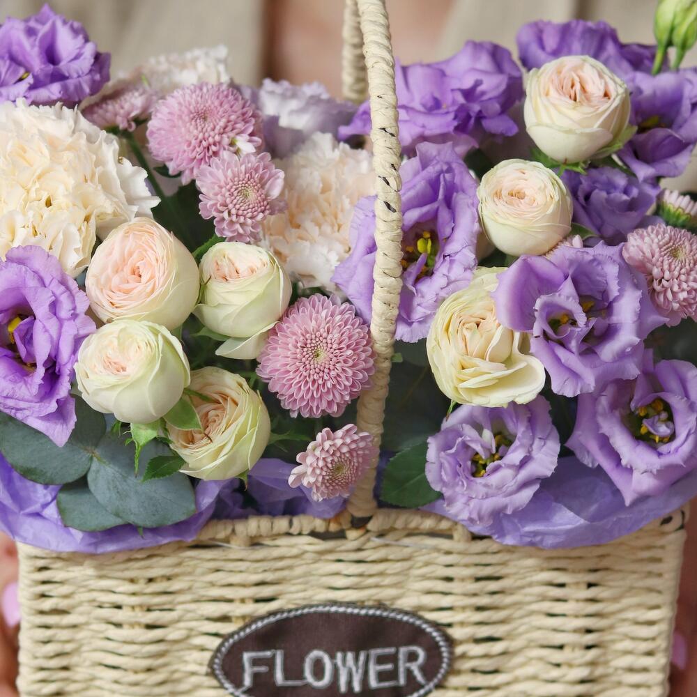 Сантини – 2 шт.Кустовая пионовидная роза – 2 шт.Корзина плетеная – 1 шт.Оазис флористический – 1 шт.Диантус лунный – 3 шт.эустома лавандовая – 2 шт.