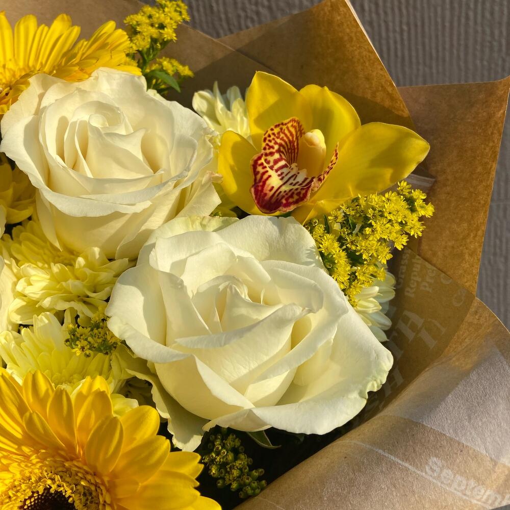 Гербера – 2 шт.Орхидея Цимбидиум – 3 шт.Рускус – 5 шт.Роза Эквадор – 3 шт.Солидаго – 3 шт.Хризантема кустовая – 2 шт.Упаковка дизайнерская – 5 шт.Лента атласная – 1 шт.