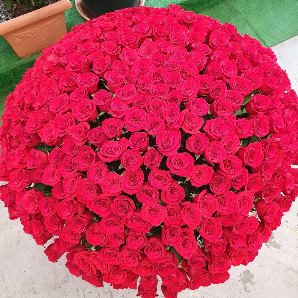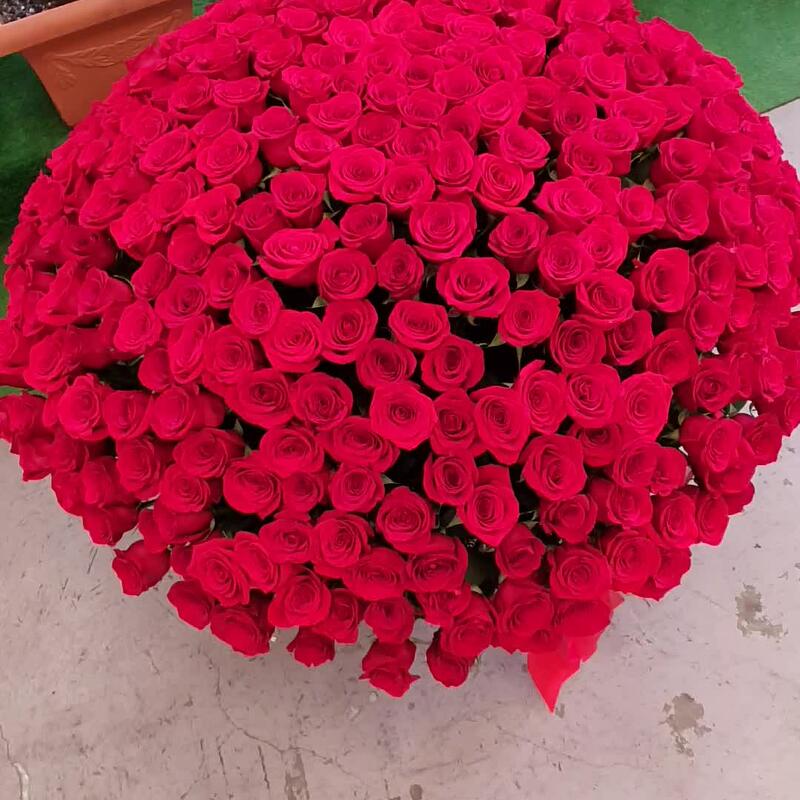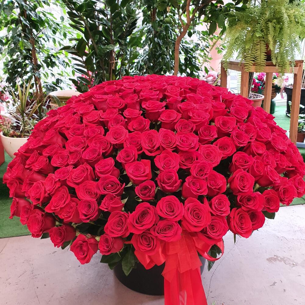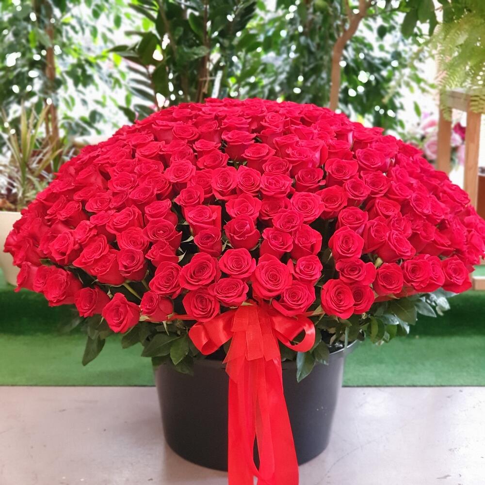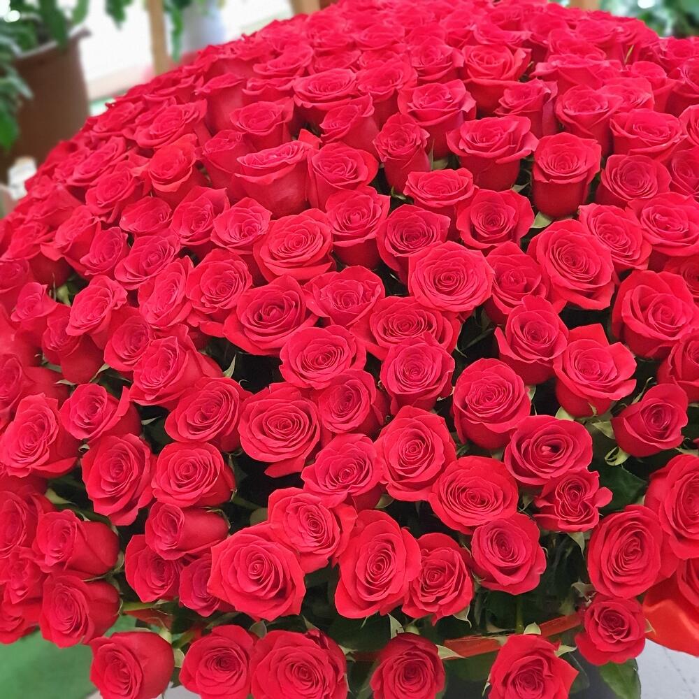Роза Эквадор – 351 шт.Кашпо – 1 шт.Оазис флористический – 10 шт.Лента атласная – 1 шт.