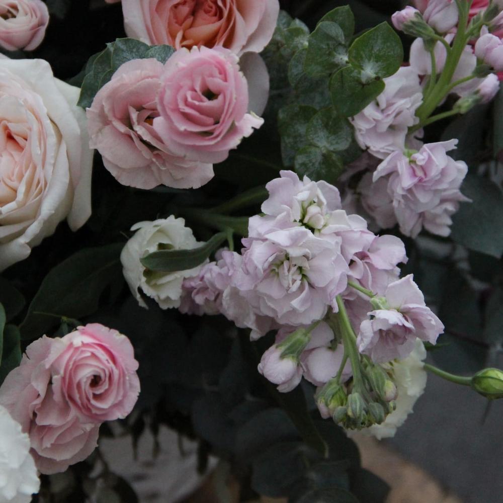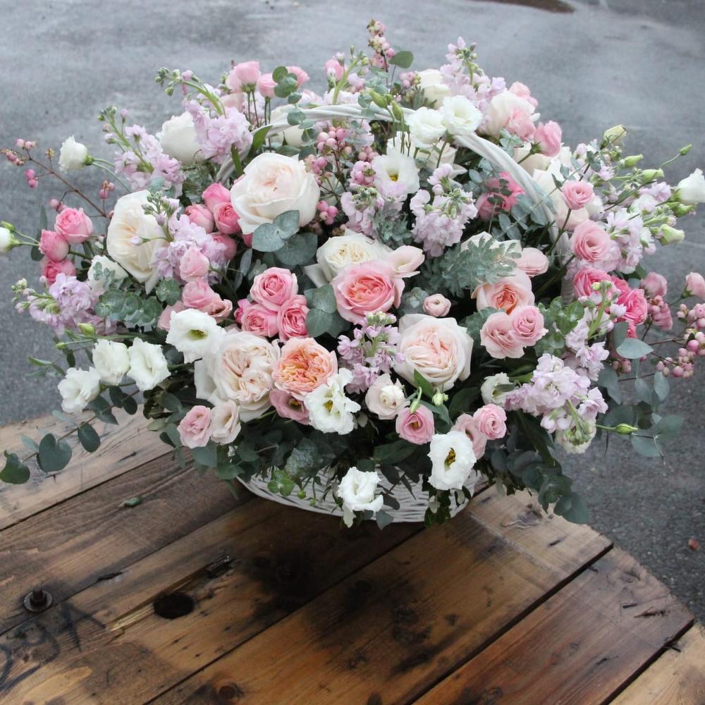 Зефирная - Корзина с пионовидными розами и маттиолой