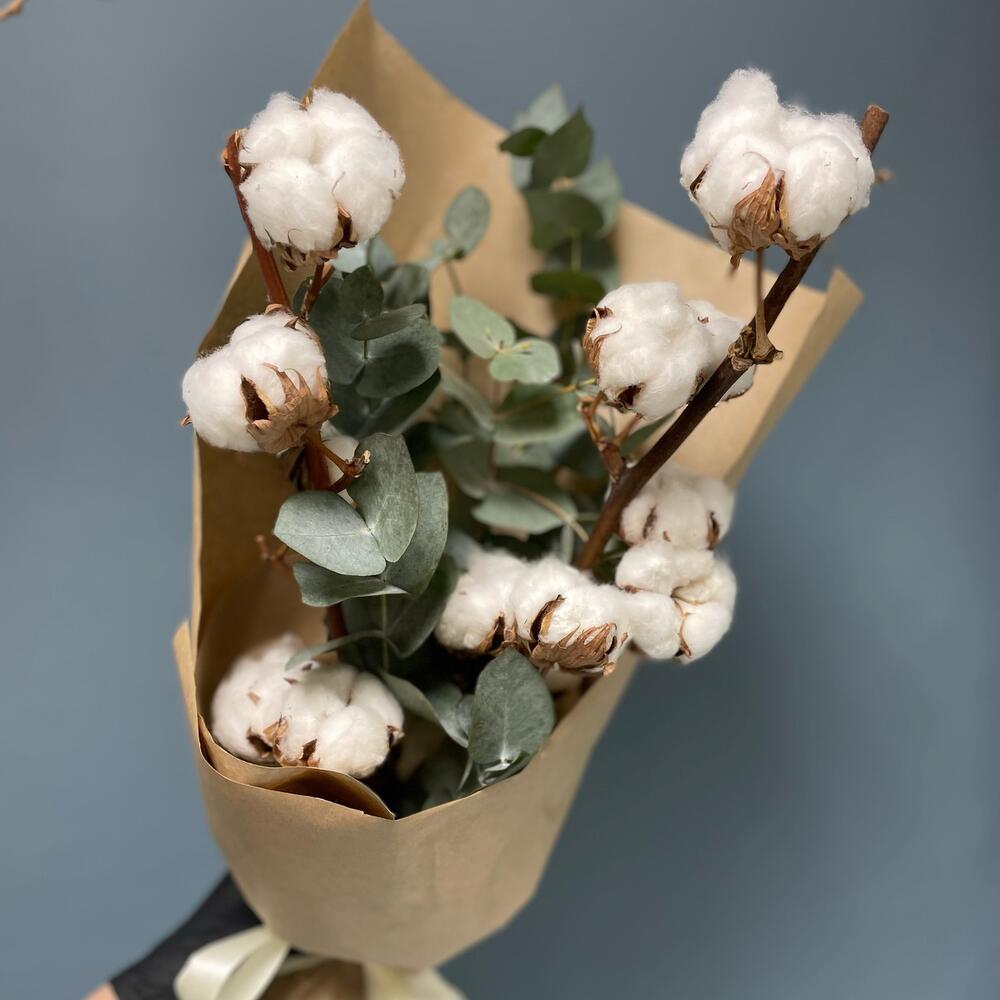 Хлопок (сухоцвет) – 2 шт.Эвкалипт – 4 шт.Упаковка дизайнерская – 1 шт.