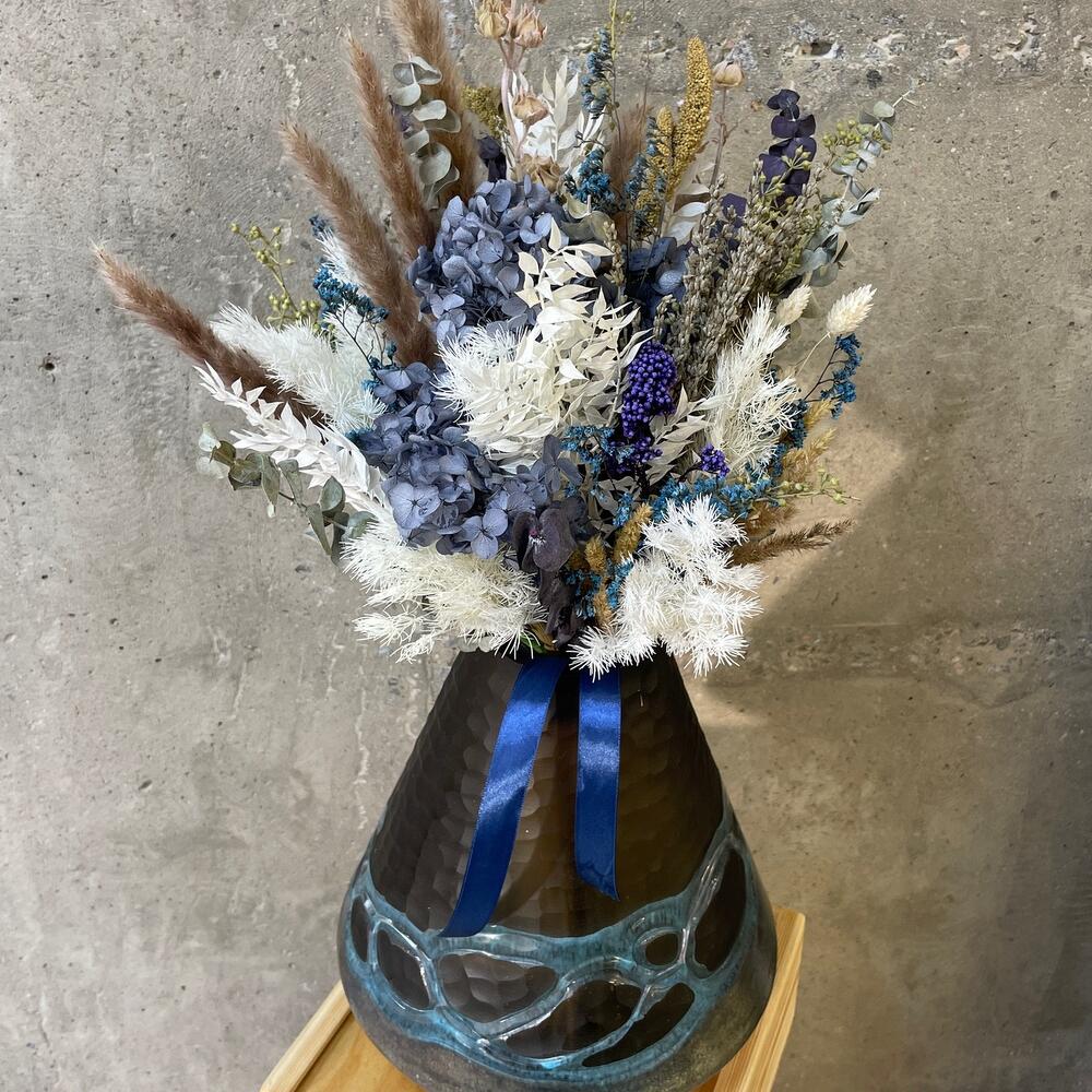 Ваза стекло – 1 шт.гортензия сухоцвет – 1 шт.Эвкалипт сухоцвет – 10 шт.рускус сухоцвет – 5 шт.аспарагус сухоцвет – 5 шт.лимониум сухоцвет – 5 шт.Лаванда пучок – 1 шт.озотамнус сухоцвет – 2 шт.сеттария – 5 шт.Ковыль – 1 шт.Лента атласная – 1 шт.