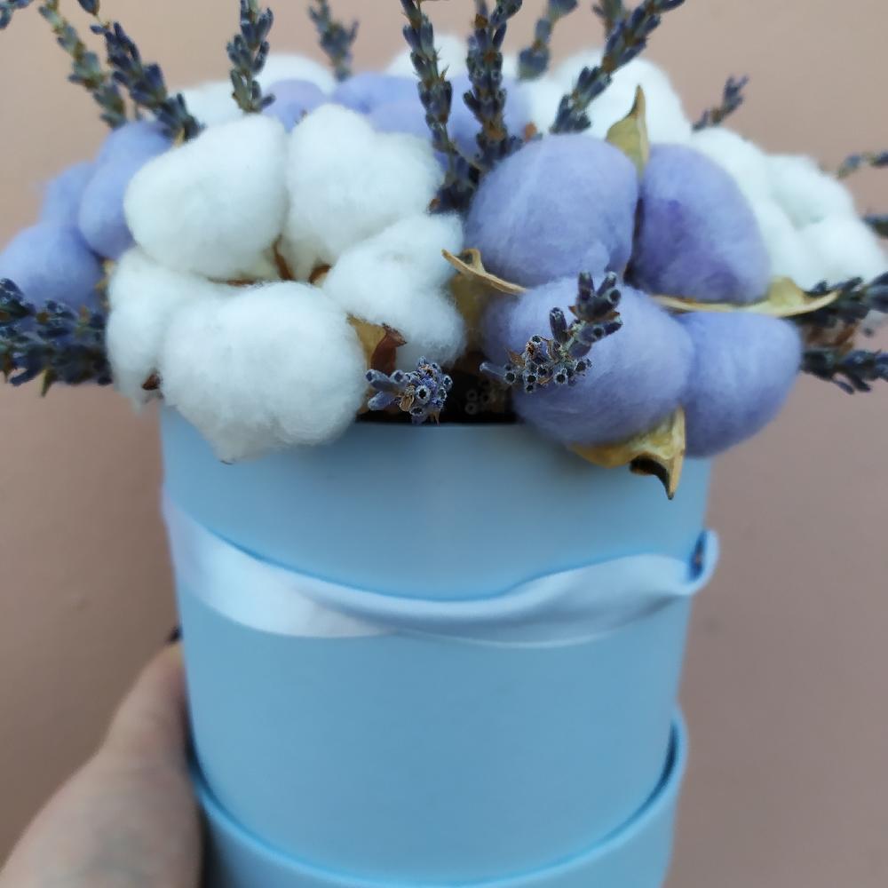 Хлопок – 12 шт.Лаванда – 25 шт.Шляпная коробка – 1 шт.Оазис – 1 шт.