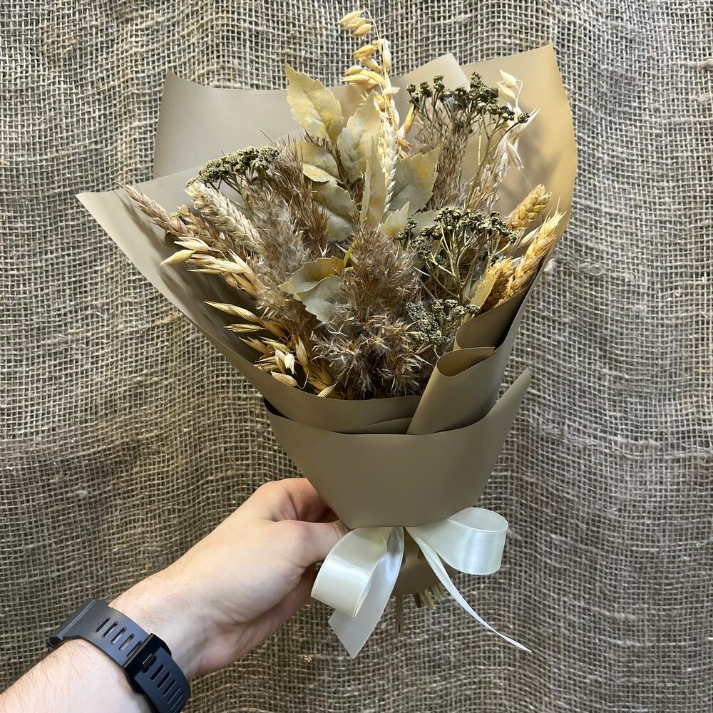 Букет из различных сухоцветов форм в корейской упаковке и атласной лентой. Природные формы гармонично перекликаются в букете.