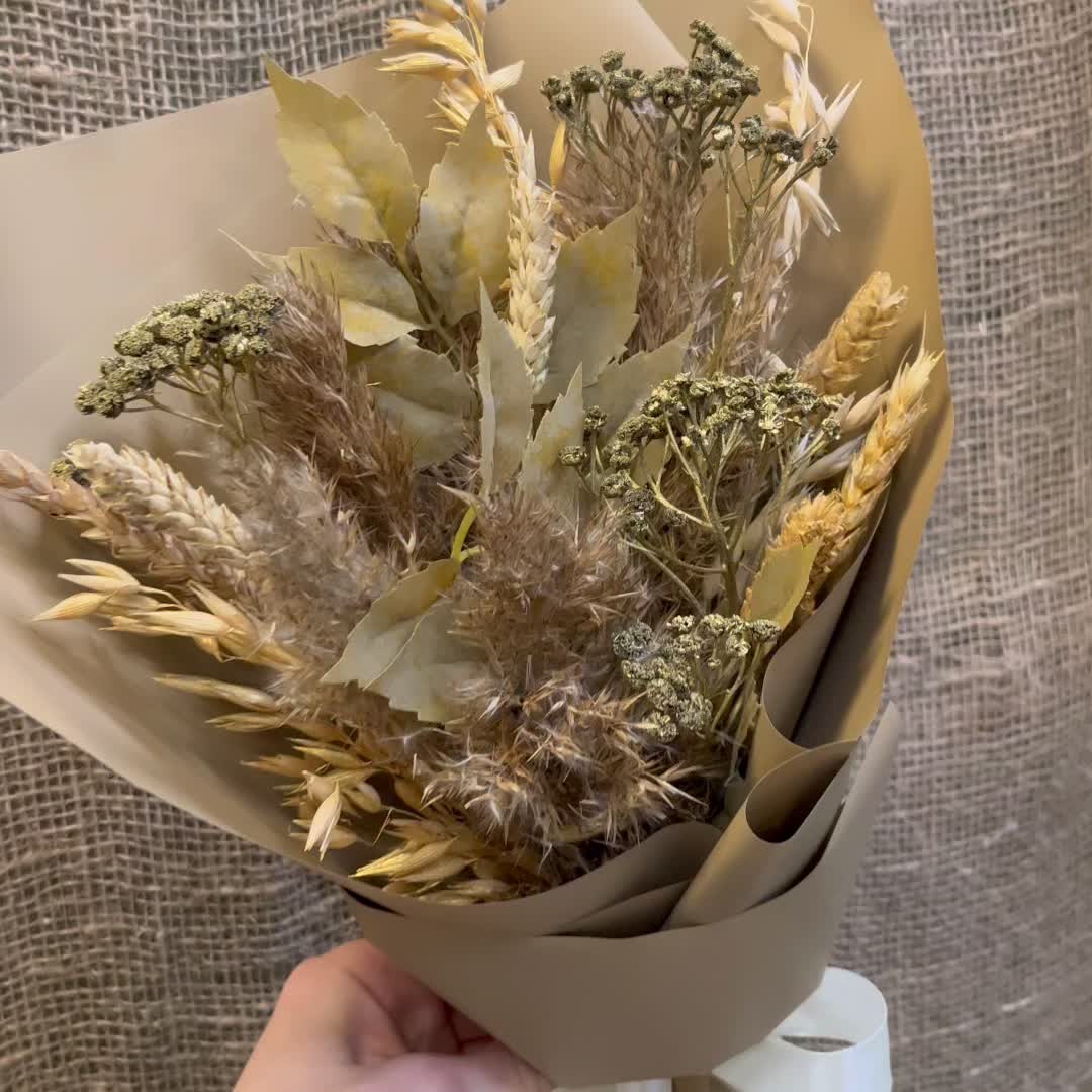 Лента атласная – 1 шт.Пшеница – 10 шт.Овес – 5 шт.Корейская упаковка – 1 шт.тысячелистник сухоцвет – 3 шт.искуственные листья – 3 шт.злак метелка – 5 шт.