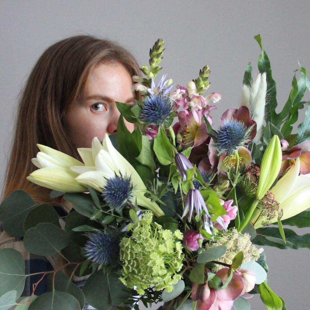 Садовый букет с лилиями, колючками, львиным зевом, хелеборусом, зонтиками, клематисом, флебодиумом и эвкалиптом.
