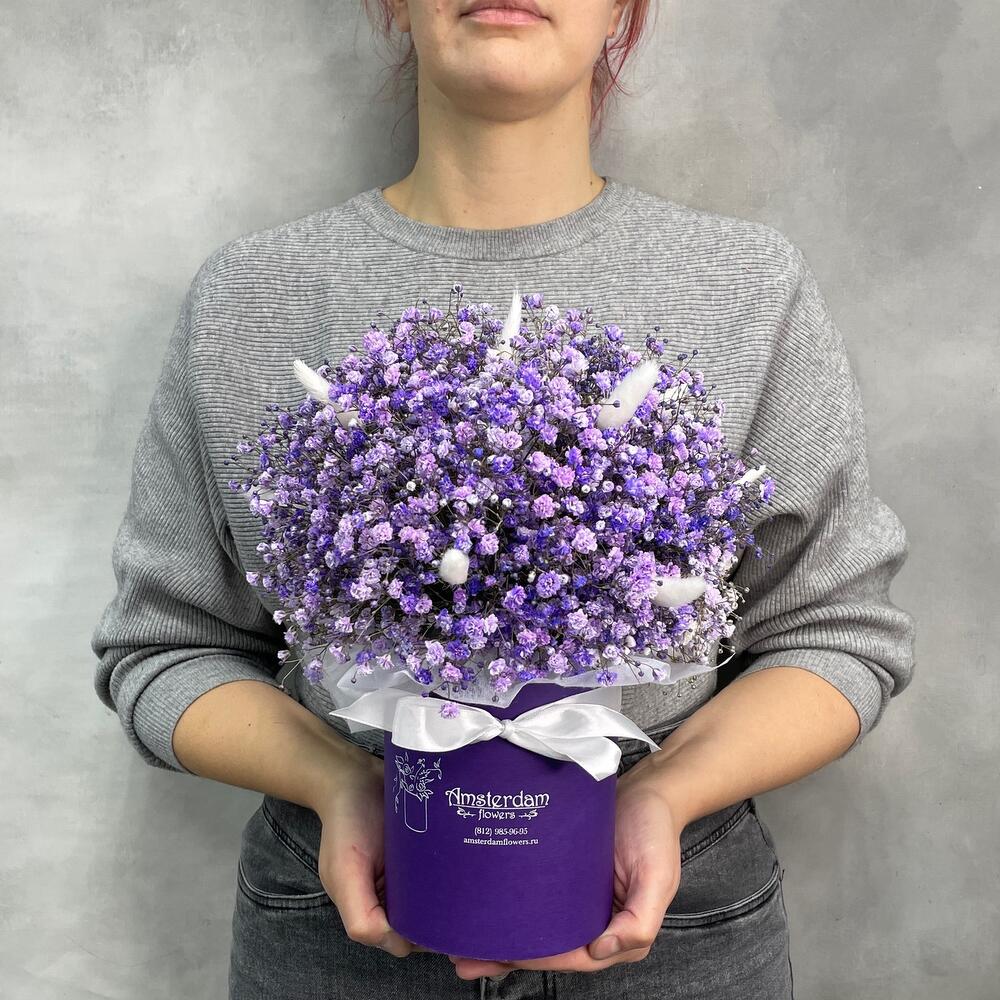 Гипсофила – 7 шт.Оазис – 1 шт.Коробка d12 – 1 шт.Лагурус (сухоцвет) – 11 шт.