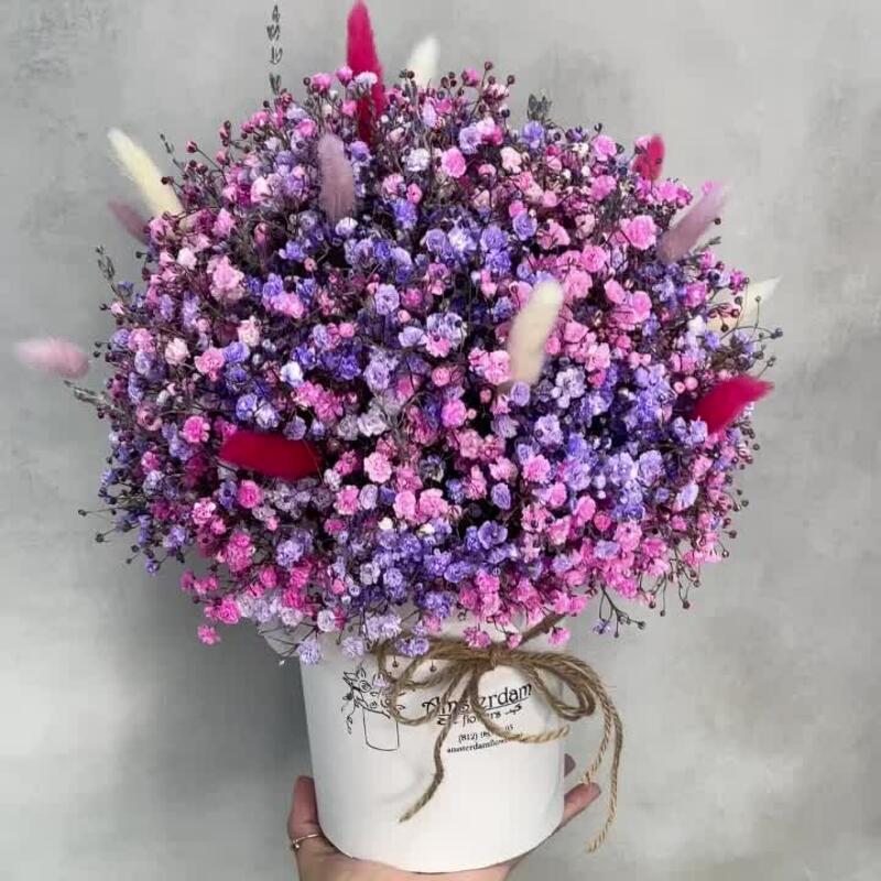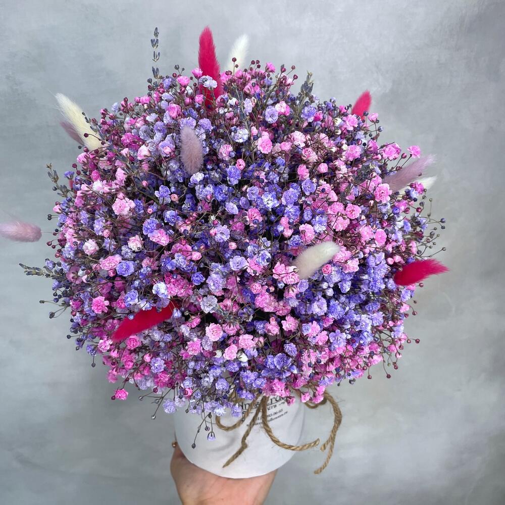 Лаванда – 15 шт.Оазис – 1 шт.Коробка d12 – 1 шт.Лагурус (сухоцвет) – 15 шт.гипсофила цветная – 9 шт.