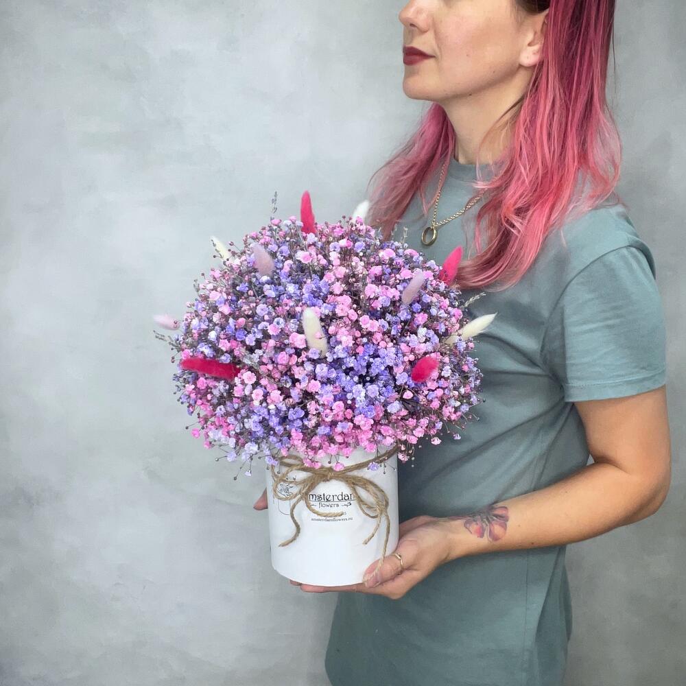 “Сиреневый туман” – композиция из гипсофилы в шляпной коробке