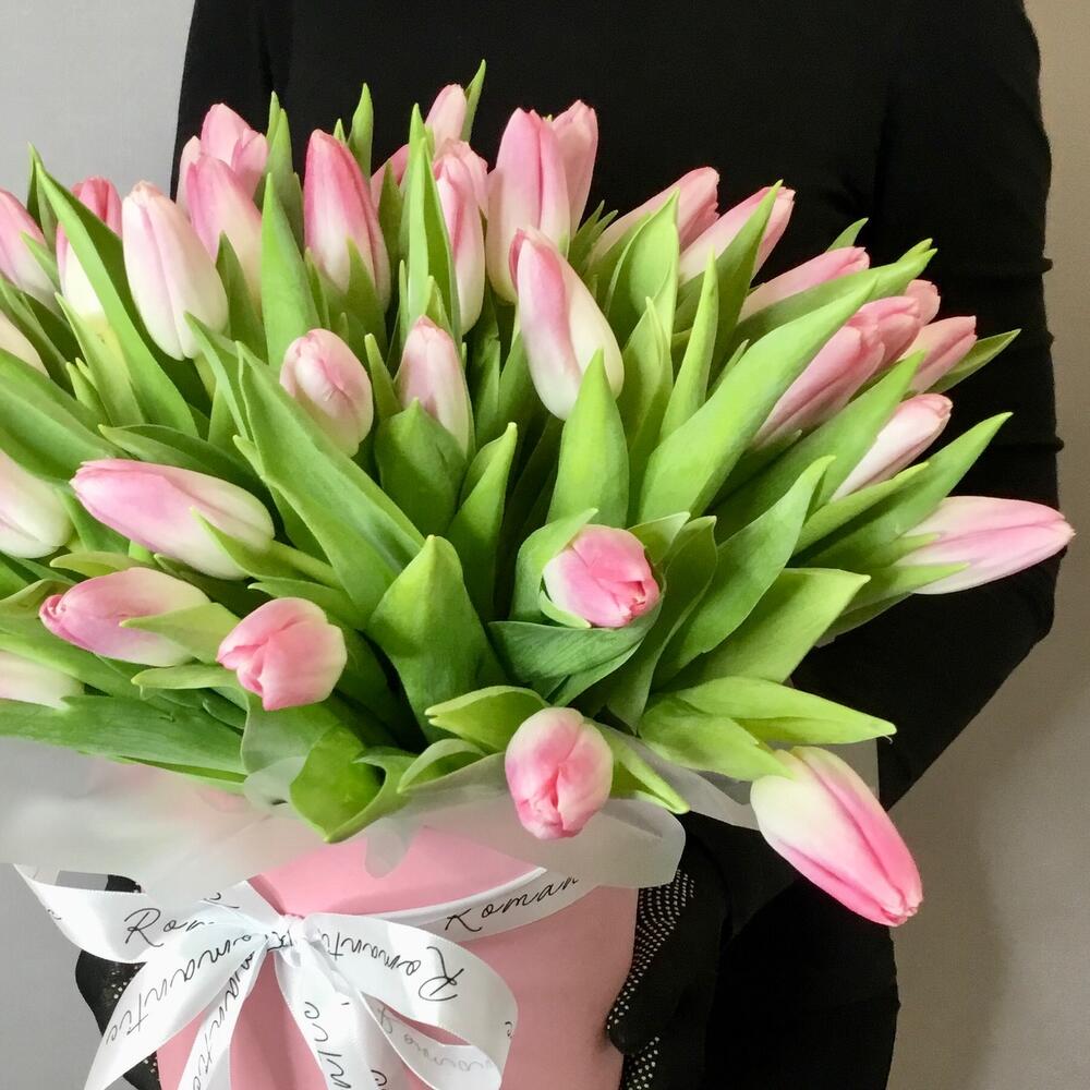 51 тюльпан в аквабоксе и в шляпной коробке