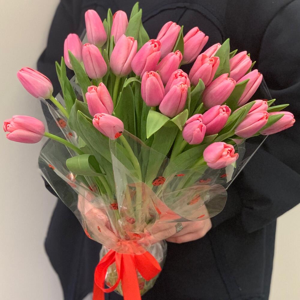 Тюльпан – 25 шт.дезайнерская упаковка – 1 шт.Атласная лента – 1 шт.Пакет – 1 шт.