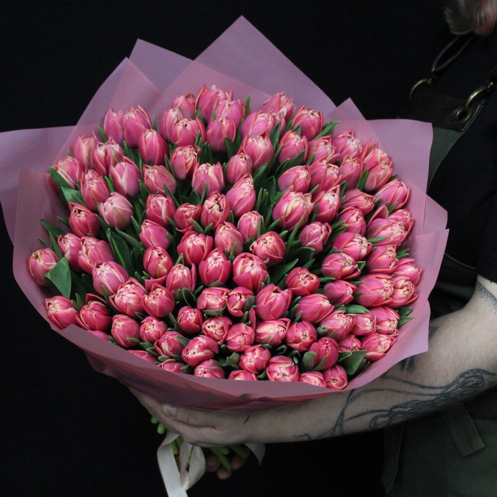 тюльпан пионовидный коламбус – 101 шт.Пленка матовая – 5 шт.Лента атласная – 1 шт.