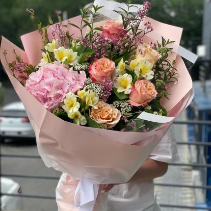 Евро-Букет из Гортензии ,Розовых Роз,Лизиантусов и Эвкалипта + открытка ручной работы в подарок